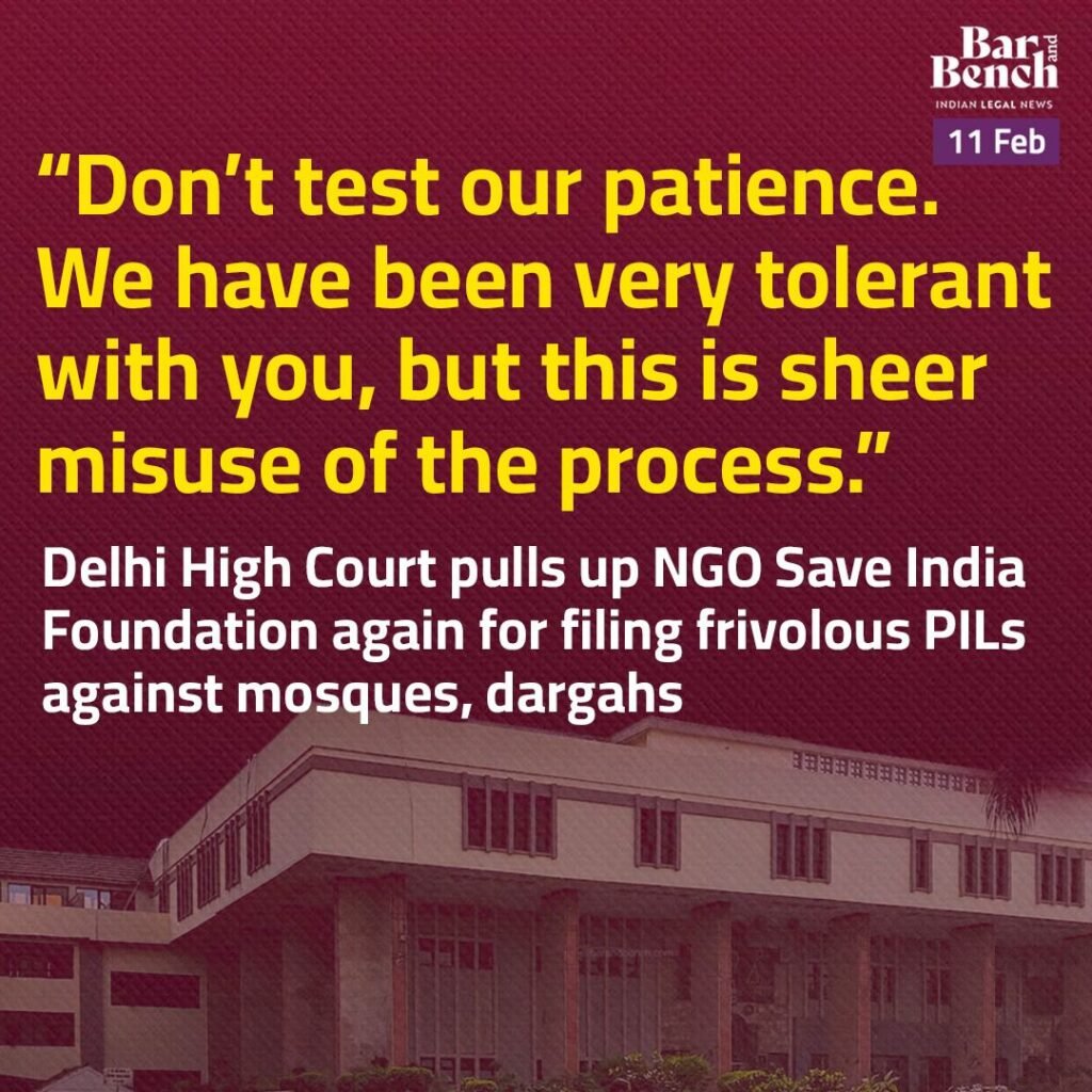 NEW DELHI – In a stern ruling, the Delhi High Court on Wednesday reprimanded an NGO, Save India Foundation, for repeatedly filing public interest litigations (PILs) against mosques and dargahs without any credible legal basis. The bench emphasised that PILs cannot be used as a tool to paralyse the judicial system or target religious sites.