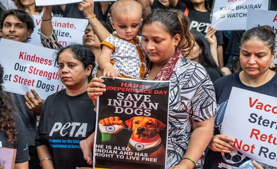 Protesters against the supreme court’s dog relocation order in August 2025. SOPA Images / Alamy