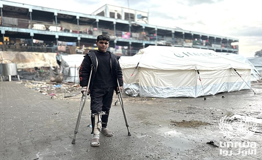 A young Palestinian man who was injured in his leg during his sixth displacement in Jabalia refugee camp, from which he was forced to flee while wounded. At the time of this photograph, on Feb. 12, his family was enduring its eighth displacement, taking shelter at Khalif Bin Zayed school, where they struggles to live with the harsh winter and the ongoing challenges of displacement. — UNRWA Photo