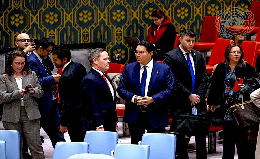 US Ambassador to the UN Michael G. Waltz, center left, with Israel’s Ambassador Danny Danon on Nov. 17, ahead of the Security Council meeting on resolution 2803 to “establish an international force to restore order in Gaza, protect civilians and open the way for large-scale aid and rebuilding.” — UN photo