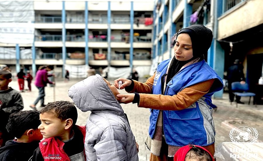 A displaced child receives a polio vaccination in UNRWA shelter inAl-Shati refugee camp during the 2024–25 Gaza Strip polio epidemic. –UNRWA Photo