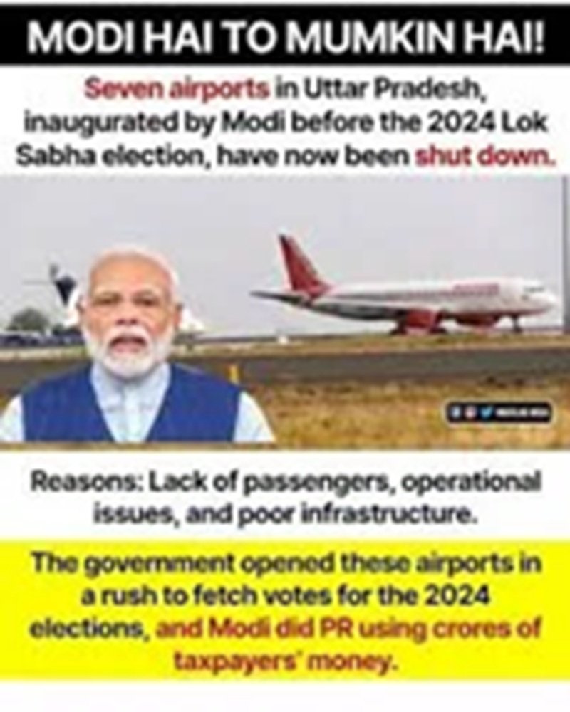 The airports—Chitrakoot, Azamgarh, Aligarh, Moradabad, Shravasti, Saharanpur, and Kushinagar—were showcased as symbols of “New India.” In reality, they have become monuments to a governance model obsessed with visibility rather than viability. Inaugurations mattered more than operations. Ribbons mattered more than routes.
