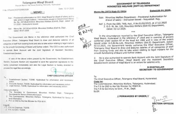 HYDERABAD — A fresh controversy has surfaced around the Telangana Waqf Board after new internal orders were issued, allegedly placing pressure on subordinate officers to carry out disputed instructions of the Minority Welfare Department, even as objections from the board’s chairman remain unresolved.