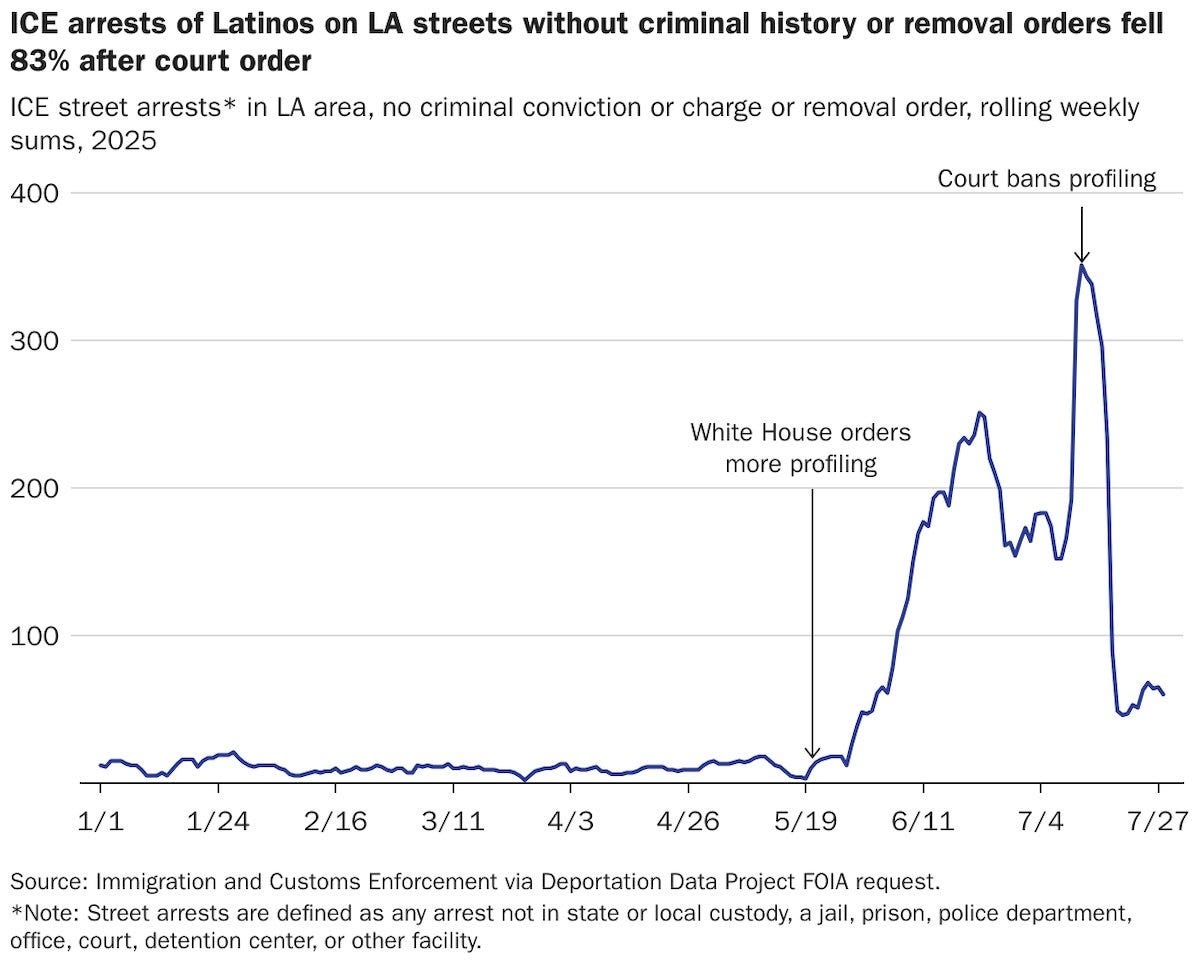In July 2025, U.S. District Judge Maame E. Frimpong issued a restraining order against ICE’s (Immigration and Customs Enforcement) “roving patrols” in and around Los Angeles, citing a “mountain of evidence” that the agency’s practices violated the Fourth Amendment, which protects one against unreasonable searches and seizures. Her order barred ICE agents from stopping individuals based solely on their race, the language they spoke, their occupation, or their presence at locations such as bus stops, farms, and car washes. Multiple documented abuses, including the detention of U.S. citizens, underscored the court’s decision. One such case involved Job Garcia, a Los Angeles resident and U.S. citizen who was violently arrested at a Home Depot while making a delivery and held for over 24 hours without cause. Judge Frimpong’s decision had a measurable impact—ICE arrests in the region fell by 66% in the 15 days after the order, providing compelling statistical evidence of pervasive racial profiling. That carefully considered and impactful ruling has now been summarily cast aside by the Supreme Court’s emergency intervention.